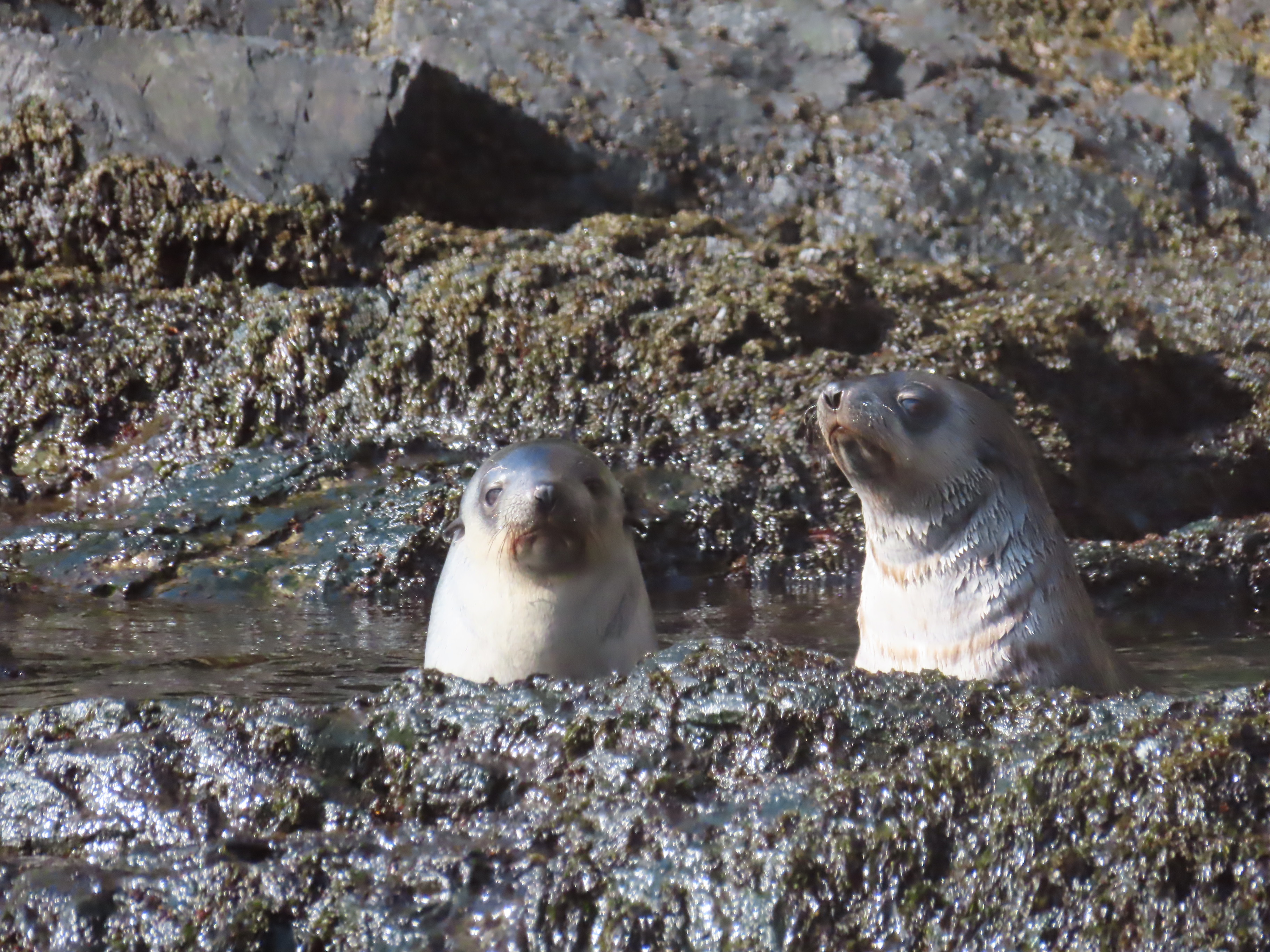 Meanwhile on the rocks below dozens of young seals are playing while their parents take a nap on the pebbles