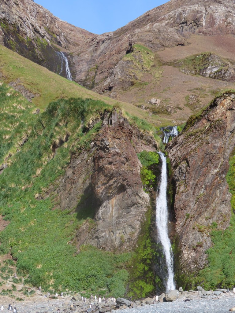 At the back of the bay there is a striking waterfall, plunging down in layers from the top of the mountain.