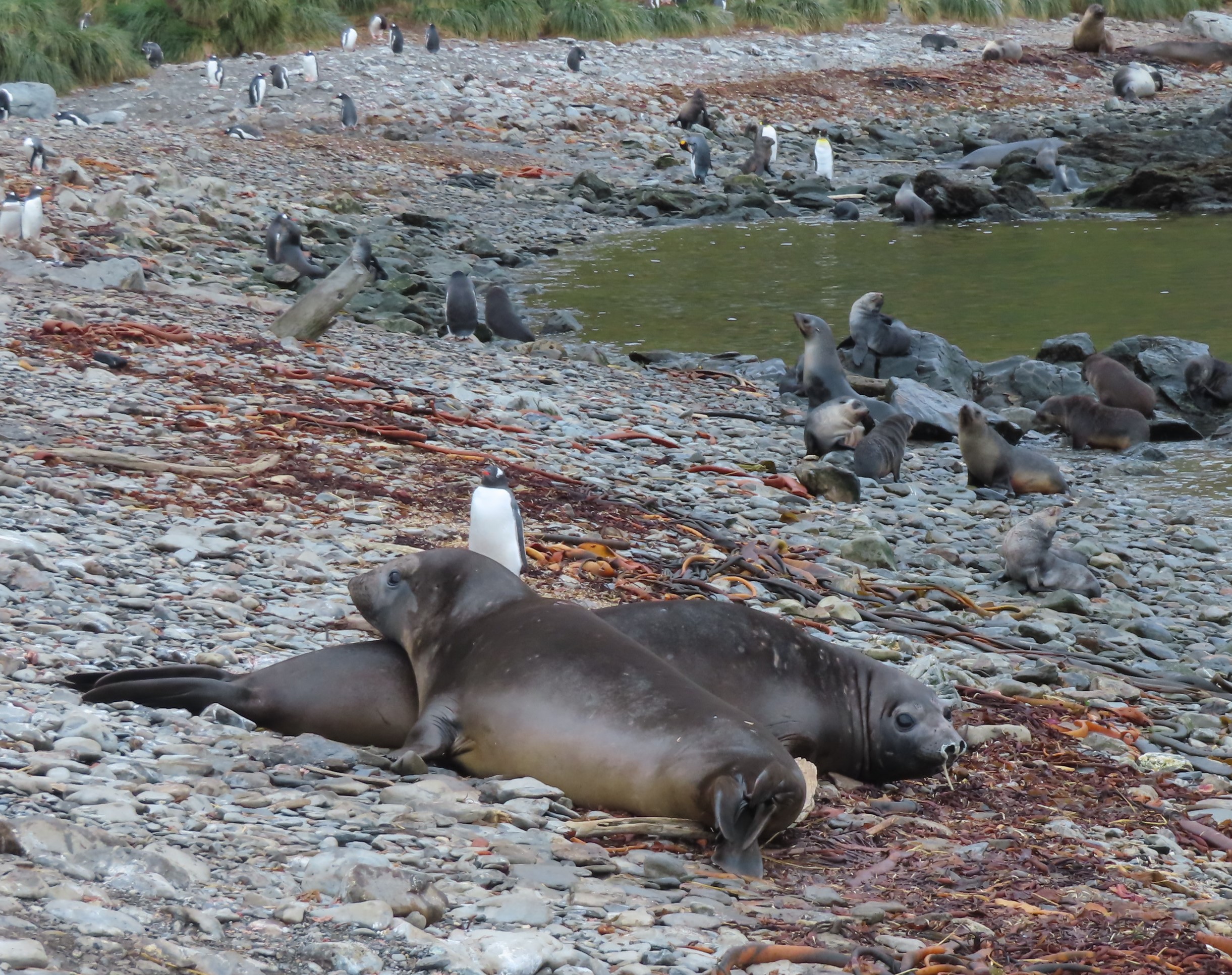 As we climb out of the zodiac on to the beach we are welcomed by a group of very young seals, that seem eager to get to know us