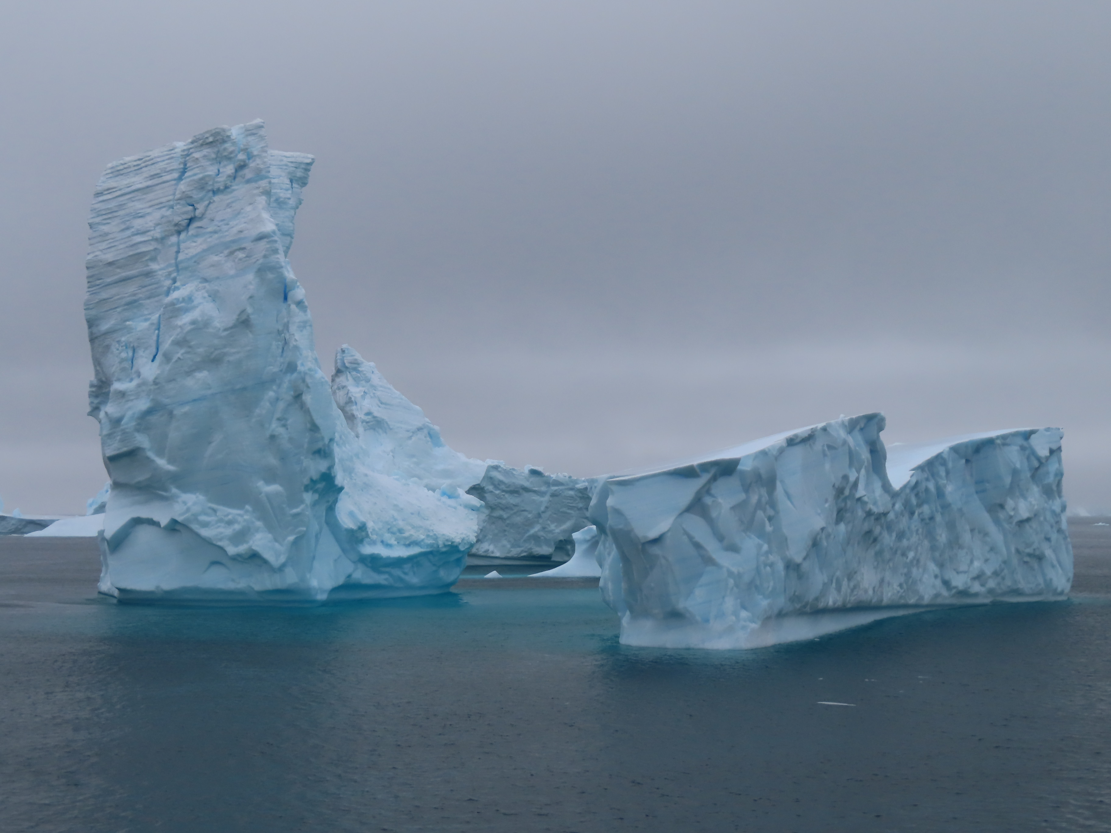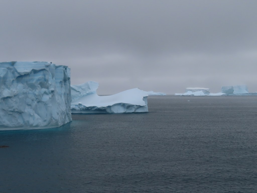 The icebergs are starkly beautiful against the dark grey sky, and at times it seems this world is just black and white with all the colour leached out of it