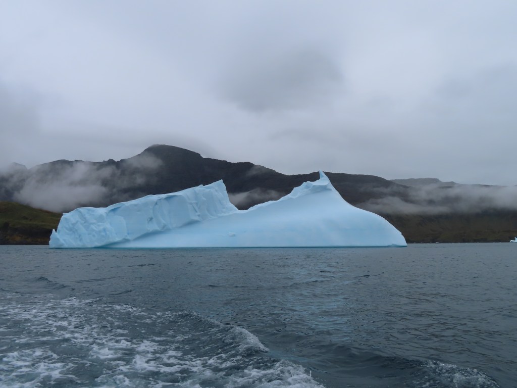 The skies are dark and ominous, but the winds are slight and the sea is calm. Progress is very slow. The ocean around Gold Harbour is full of icebergs. It is a wonderful if slightly unsettling sight