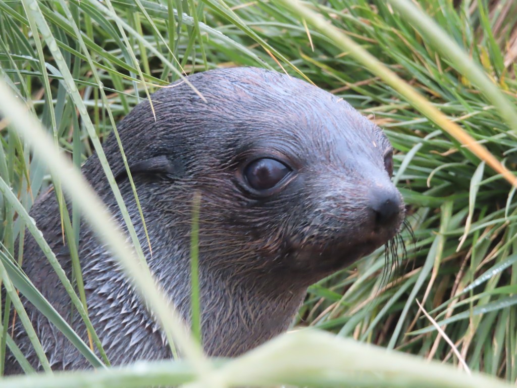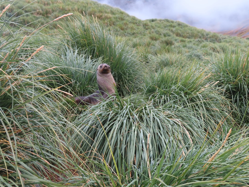 The beach is very narrow. Behind me the tussock grass is alive with seals, most of them hidden from view, but a precocious teenager wants to check me out