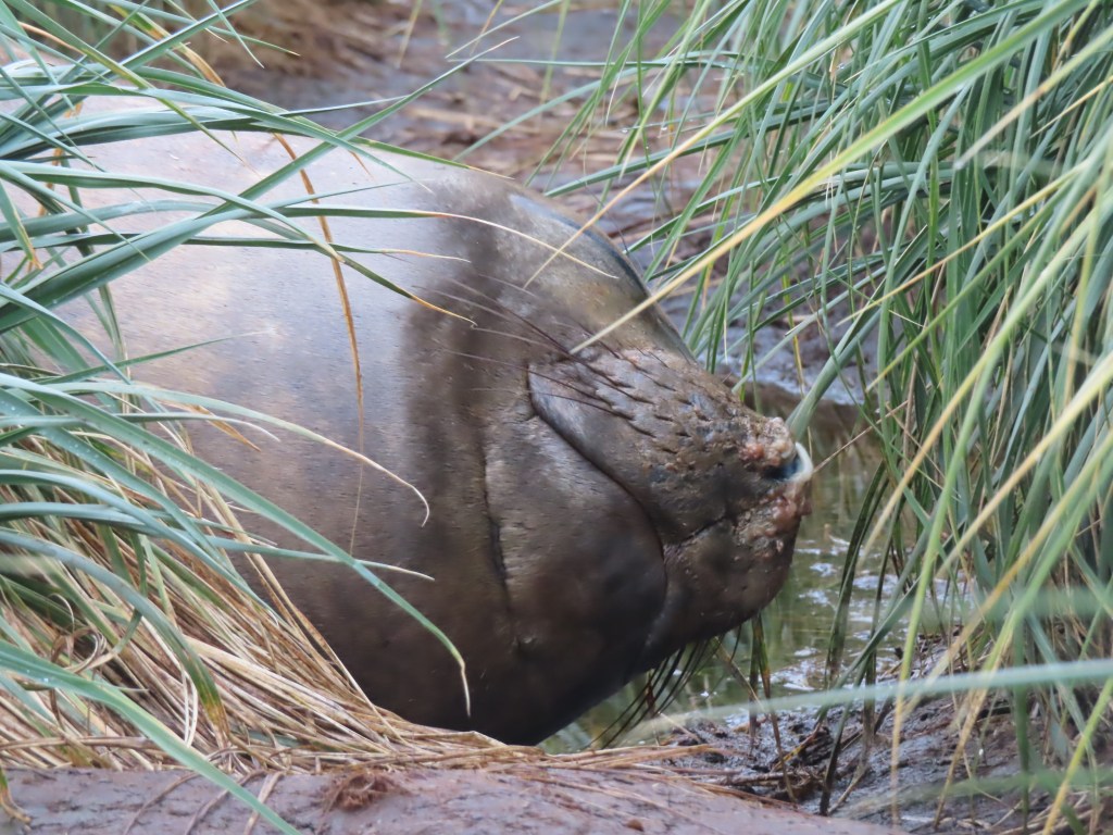 Then I hear a loud snore. At first I think it must be Gordon, but he decided not to come on this trip. I take a closer look in the grass and spot the enormous head of a female elephant seal, eyes closed, nostrils flared blowing out huge snores every few seconds. I am so close I can smell her fishy breath. I have to take a step back – she hasn’t flossed in a while.
