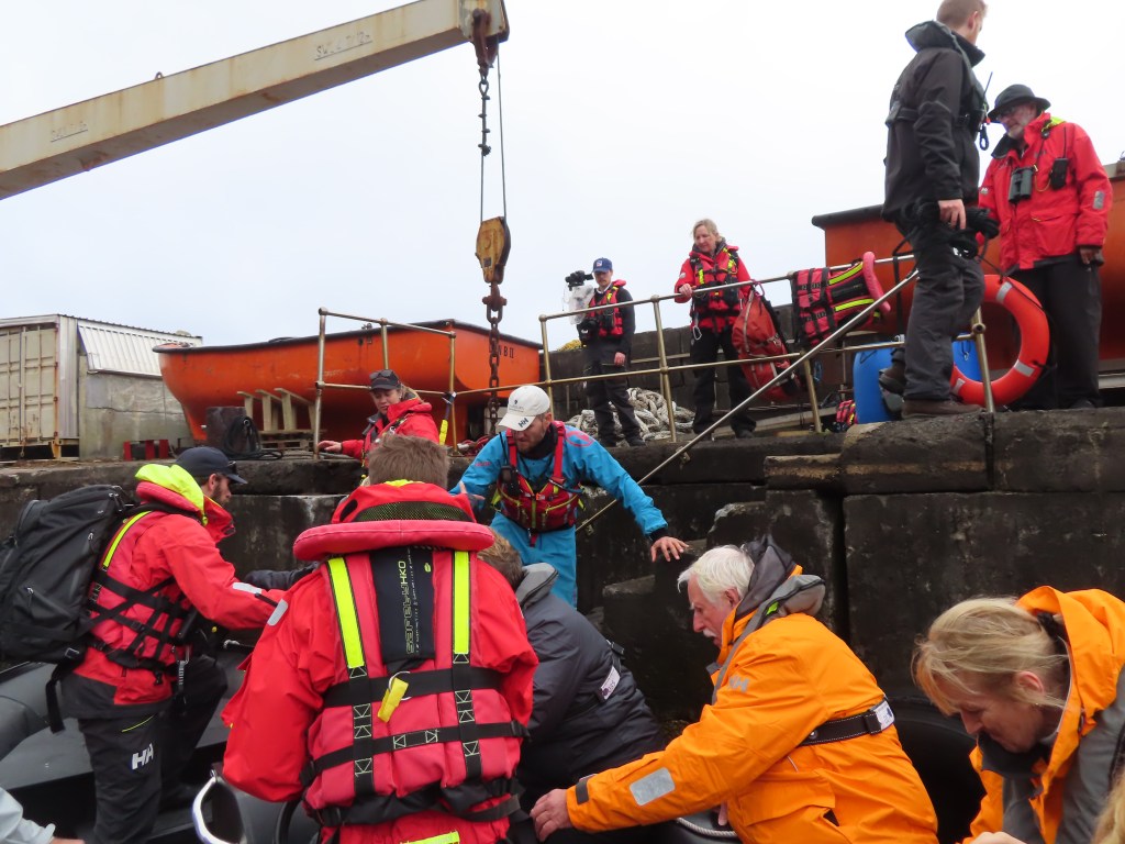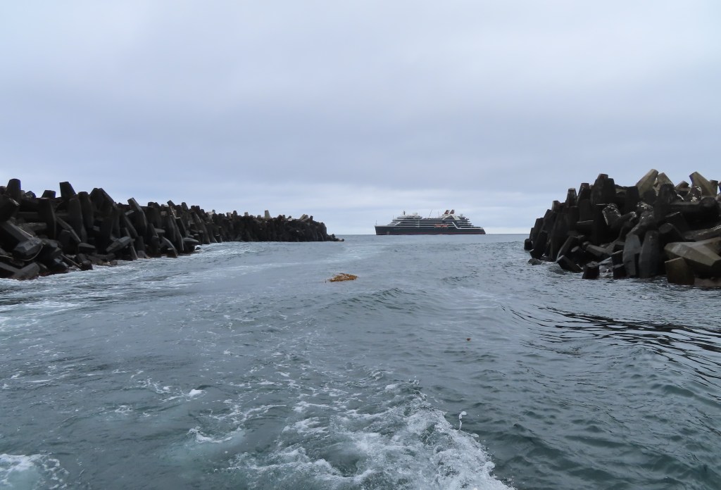 The zodiacs are launched and ready. The crew know that we have tried to land here before and make sure that we are in the first zodiac. We are ready! But we have been warned that the small harbour, for want of a better name, was poorly built and instead of sheltering you from the waves it actually acts like a funnel and the waves can be tricky within the harbour walls.
