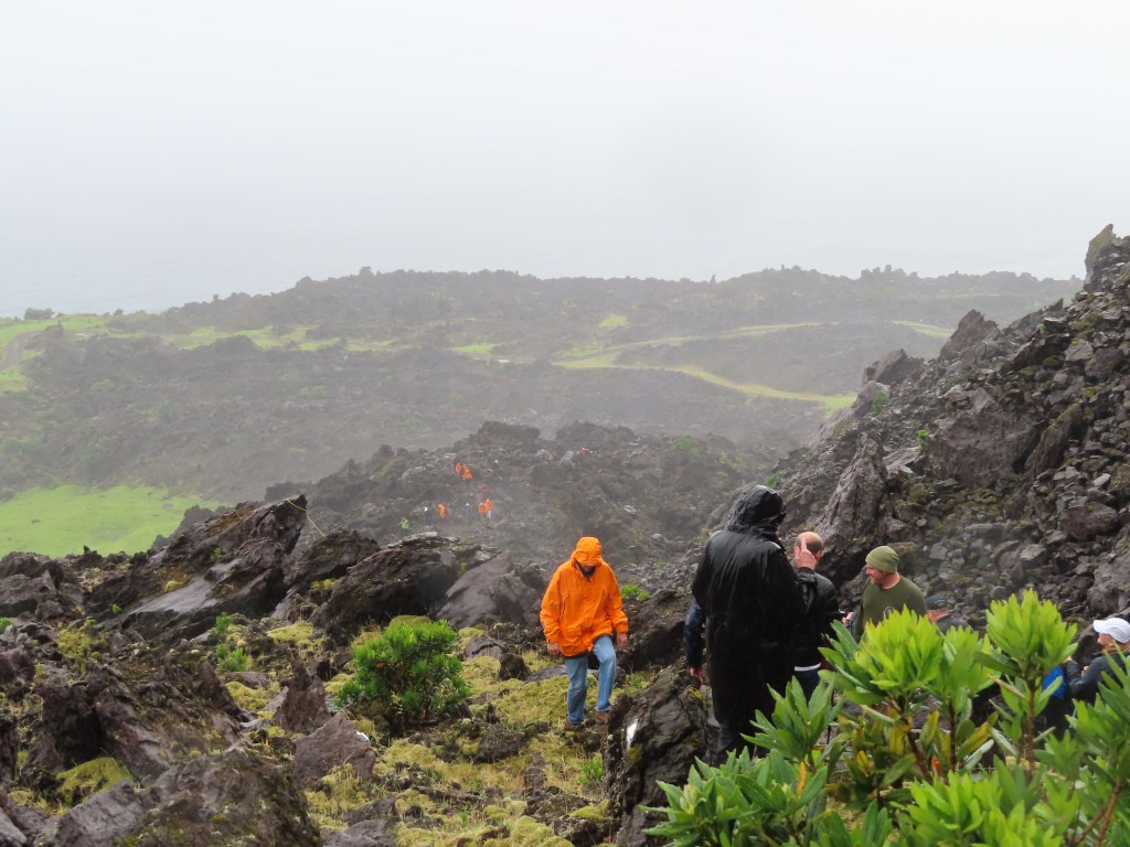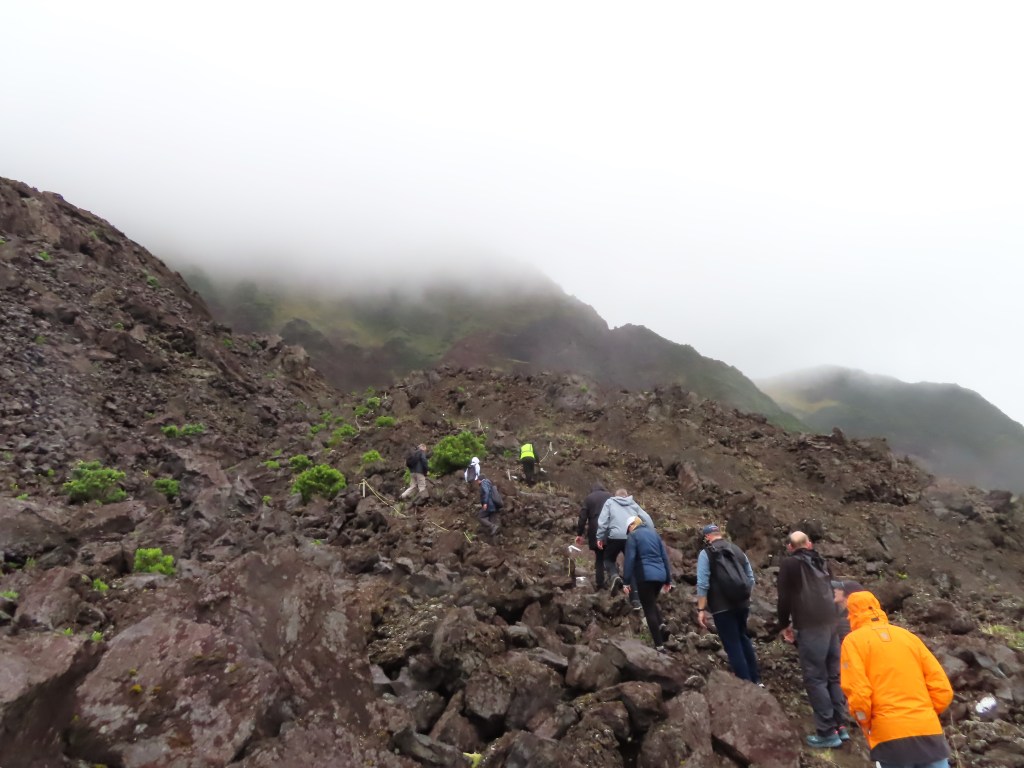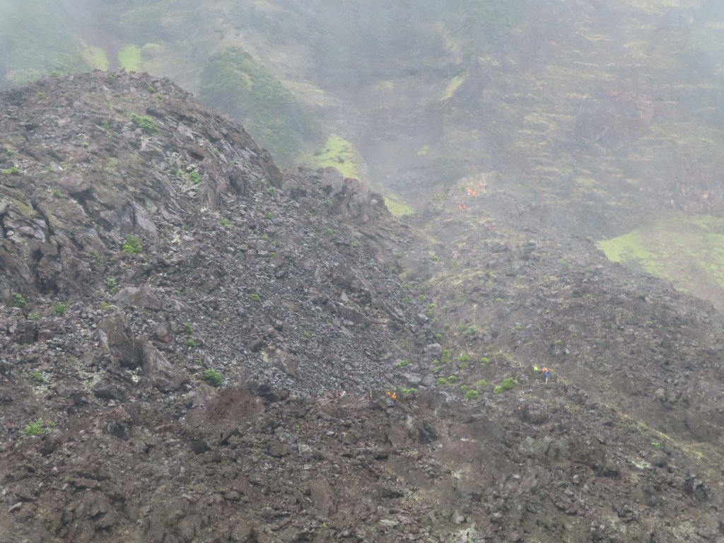 As we head back down, the rain eases and I turn. Using the zoom lens, I take a quick shot of the next group making the climb – you can see the orange specs of their parkas dotted up the side of the mountain