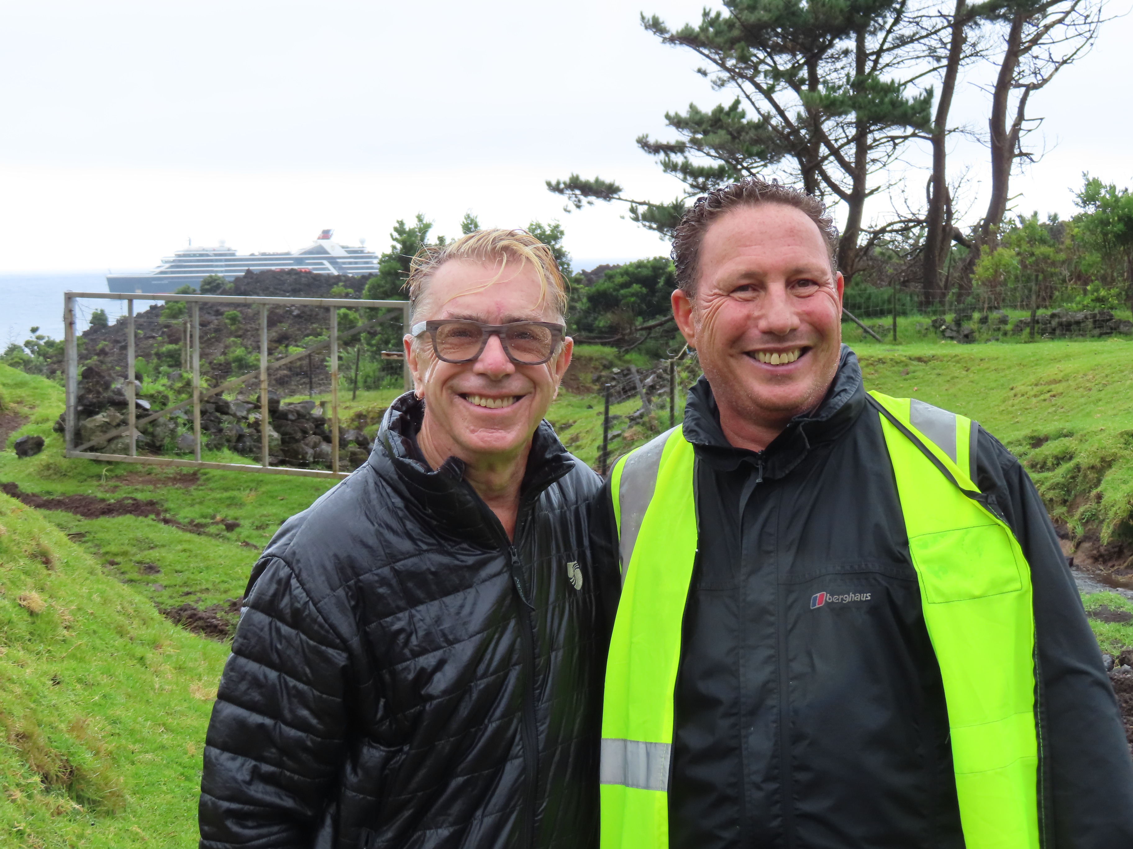 We have reached the most remote inhabited island in the world. And the islanders are proud of it. (If we look a little damp it is because we are soaking wet!! It rained non stop as you will see)