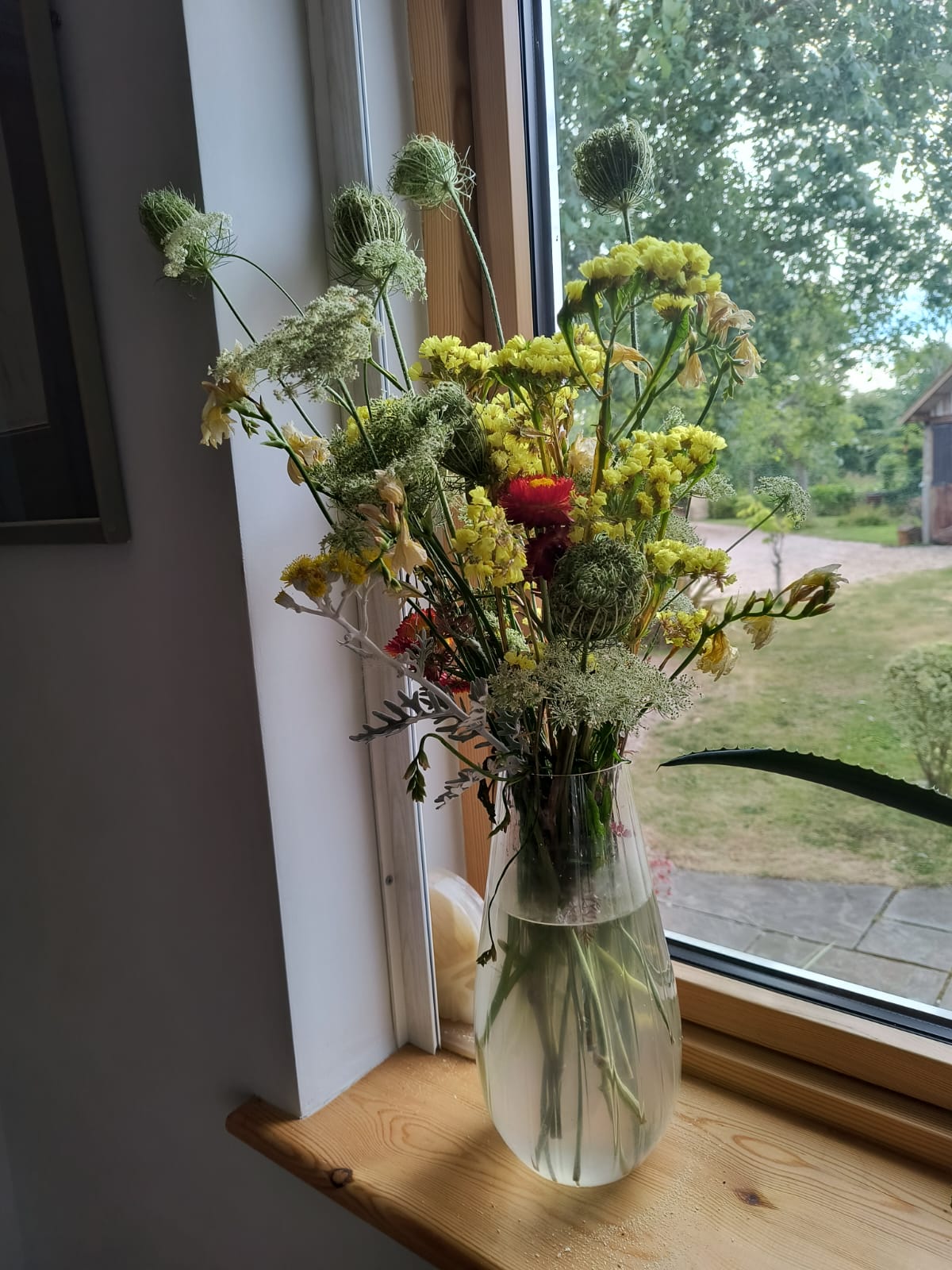 It is miles from the nearest village, with not a neighbour in sight. A gravel driveway leads up to the house. The large garden is of course totally natural and totally organic, given over to an unruly selection of wild flowers and grasses allowing the help to leave us floral decorations such as this