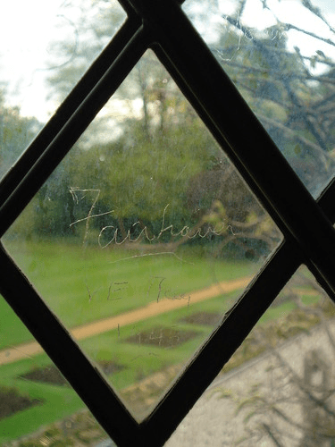 So…… When fully clothed, his life at the house revolved around horse racing and entertaining. He had a stud nearby where he kept several racehorses. He attended Newmarket races regularly and here he met the Queen. He invited the Queen and other Royals for drinks before and tea after the races, as one does. They became frequent visitors. They even signed the guest book. Actually Huttleston’s guest book was a little unusual. He provided his guests with a diamond pen and asked them to scratch their names onto the windows of the house.