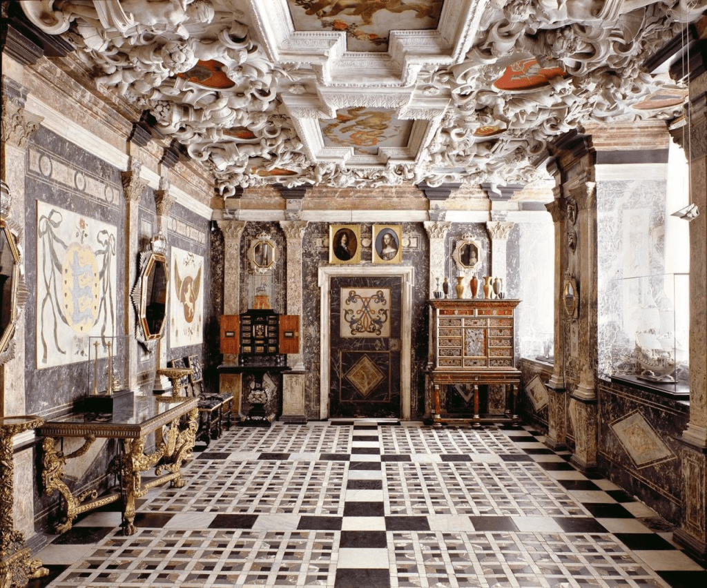 But it wasn’t just silver that King Christian liked. He enjoyed a touch of marble as well. It could be anywhere, on the floor, on the wall or on the ceiling. And in the case of the aptly named ” marble room”, on all of those