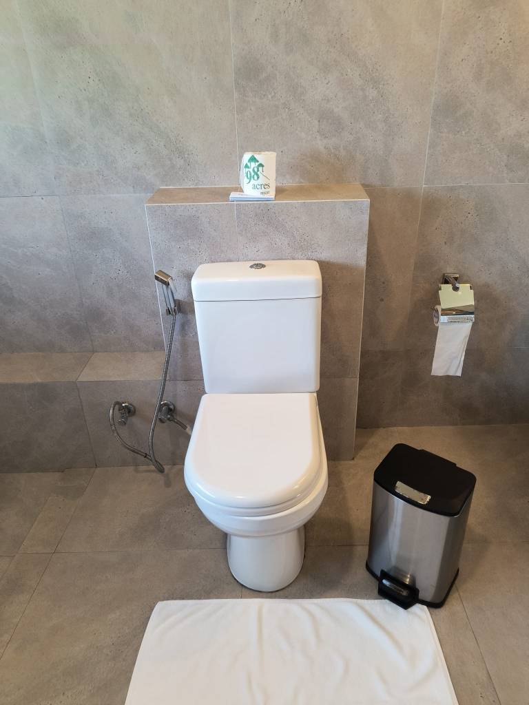 I have been in Sri Lanka for a week now, and stayed in three different hotels. Each one has been wonderful, and each one has a very stylish bathroom. But they all suffer from the same problem. The toilet roll holder is out of reach. The problem seems to be exacerbated by the positioning of the toilet. Instead of being flat against the wall it stands about a foot away from it. The reason is that they don’t hide the plumbing in the wall, they box it in, in front of the wall and then the toilet abuts (you had to know I was going to use that word!) to that. So to clarify what I mean, here is a photo of the toilet in the bathroom at 98 Acres in Ella
