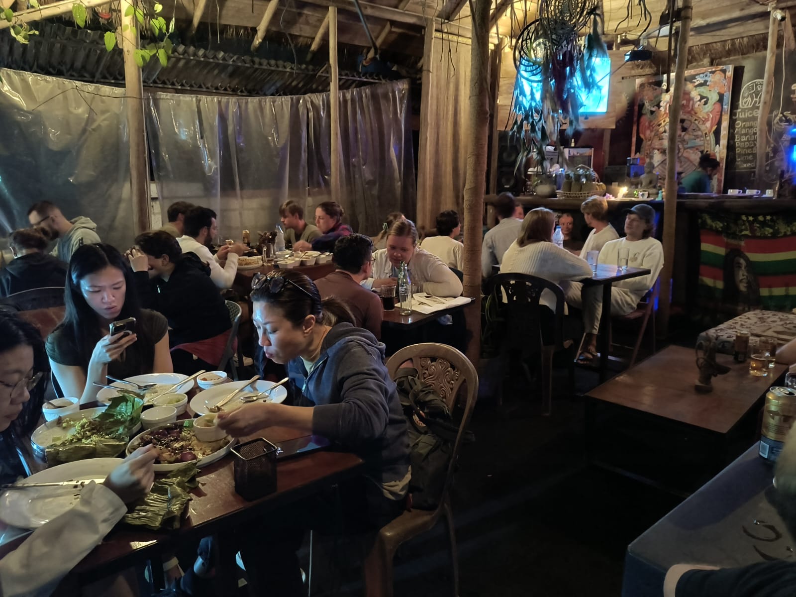I don’t know what I was expecting, but this definitely wasn’t it. The wall facing the street was basically a row of bamboo blinds hanging down from the roof, which was a mix of bamboo, palm fronds and corrugated iron. Inside the floor was a hodge podge of wooden planks that looked as if they had been “rescued” from derelict homes.