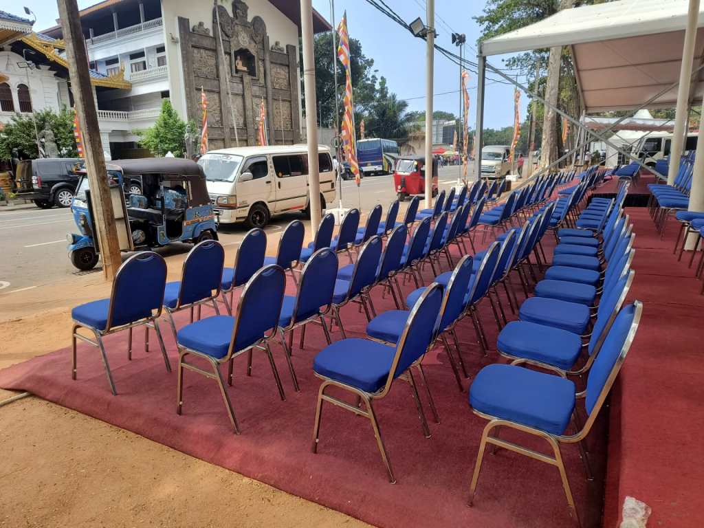 We pass by the Gangaramaya temple, where the dignitaries will sit. Across from the temple, there is a covered wooden platform with ten rows of rather grand upright wooden dining chairs with cushions. A definite step up from the plastic chairs the rest of us will be sitting on. Next to them is another platform, a little lower down with ten rows of brand new metal chairs with padded seats and backs, upholstered in a rather smart royal blue. Now that’s where I belong, I muse. That would do very nicely.
