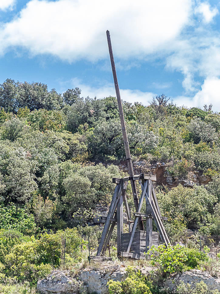 In the 12th and 13th centuries Minerve was a centre for the Cathar religion, a religion that believed in two Gods, one good and one evil. Not so very different from God and the Devil, but they were viewed as heretics by the Catholic church. In 1210 Simon de Montfort, a French nobleman and one of the great military commanders of the Middle Ages, laid seige to the town. The town knew what was coming and had done what it could in preparation. They had built four trebuchets, a giant medieval sling used to launch huge rocks at the enemy. It was the weapon of choice before canons and guns. Actually it was about the only weapon.