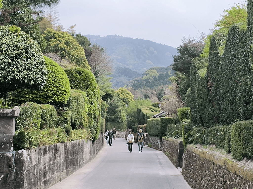 Chiron is up in the mountains. The weather is miserable, but the setting is still stunning. The samurai houses are hidden behind scuptured hedges and trees on either side of a walkway,
