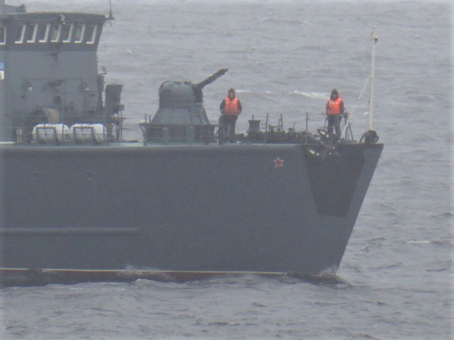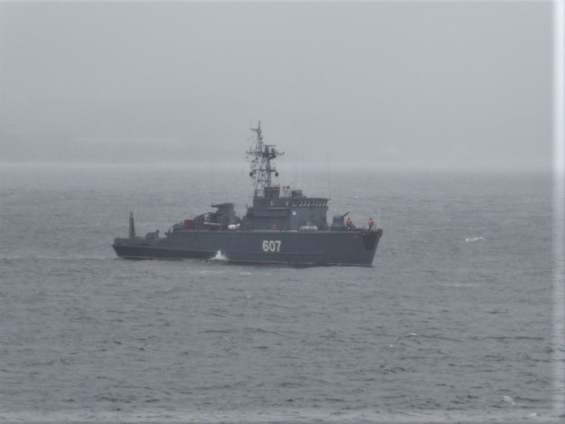 The first sign that we have crossed into Russian waters is when three small battleships appear seemingly out of nowhere and “accompany” us on our journey. Each has a large gun at the back and a smaller gun on the bow, although when it is pointing your way the relative size of the gun makes little difference.