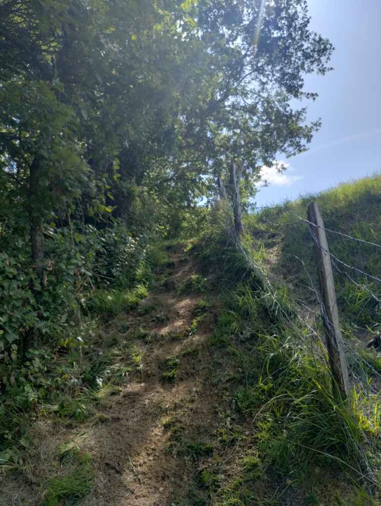 We walk up the track until we come to a stile. The other side of the stile is a wide grassy path leading up and across the field