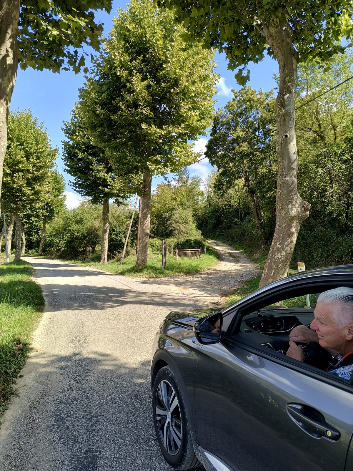 Brambles are scraping the sides of the car. But there is no room to turn around, or park.