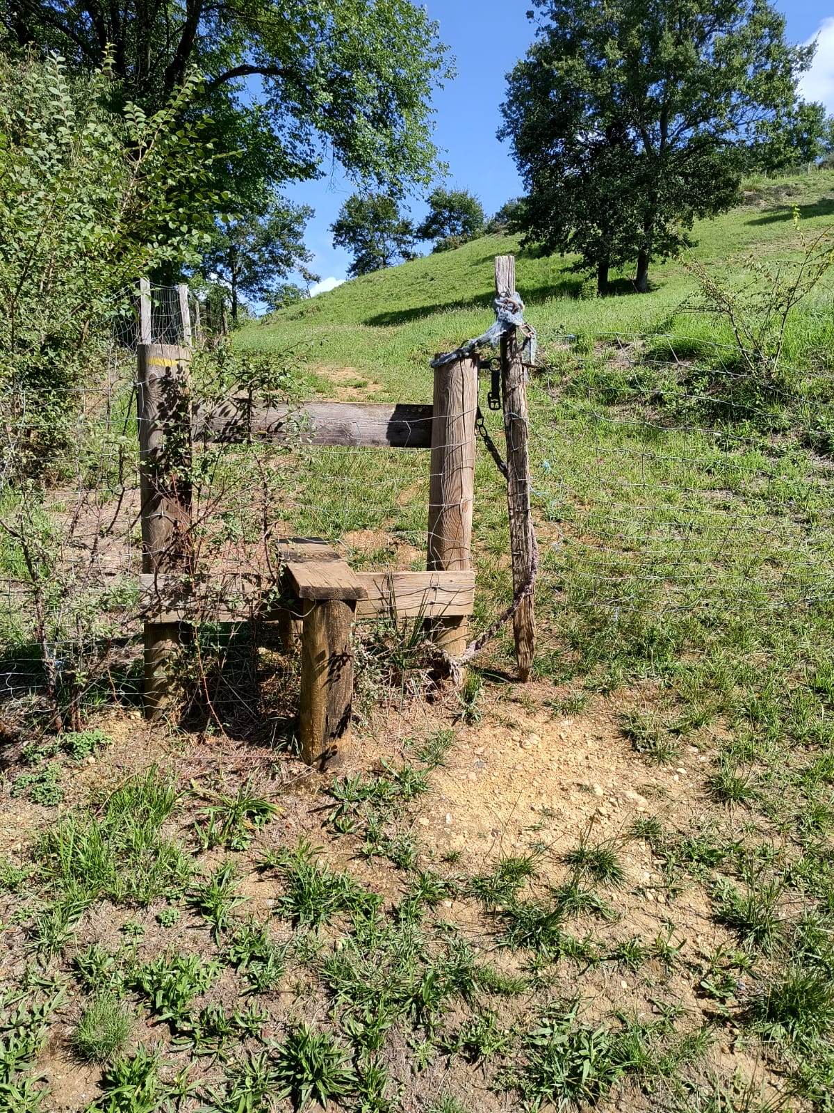 We walk up the track until we come to a stile. The other side of the stile is a wide grassy path leading up and across the field